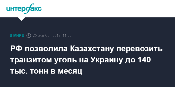Москва. 25 октября. INTERFAX.RU - Казахстан сможет провозить на Украину уголь через территорию РФ в объеме 140 тысяч тонн в месяц, сообщило министерство торговли и интеграции республики в пятницу.