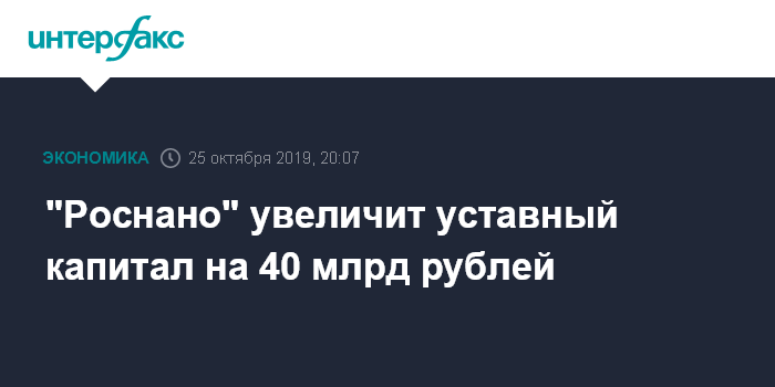 Москва. 25 октября. INTERFAX.RU - Госкорпорация "Роснано" проведет допэмиссию и увеличит уставный капитал на сумму до 40 млрд рублей ради участия в нацпроектах и таких программах как "Цифровая экономика", "Международная кооперация и экспорт" и другие. Об этом сообщил представитель корпорации.