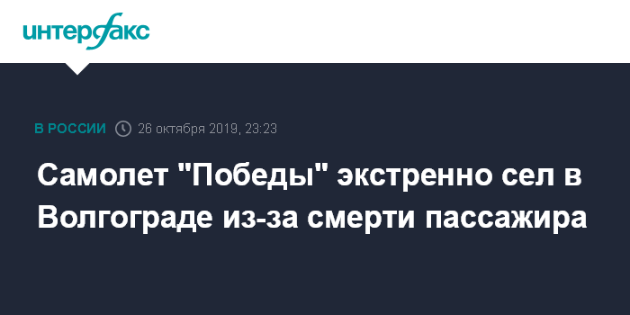 Москва. 26 октября. INTERFAX.RU - Самолет авиакомпании "Победа", летевший из Санкт-Петербурга во Владикавказ, экстренно приземлился в субботу в аэропорту Волгограда из-за смерти пассажира, сообщил в субботу агентству "Интерфакс" информированный источник.