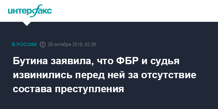 "Меня даже в шпионаже не обвиняли никогда. Это все медийный образ. (...) Они (ФБР - ИФ) даже потом передо мной извинялись. И потом прокуратура извинилась и даже судья сказала на процессе, что ей хватило 5 минут, чтобы разобраться, что никакого состава нет", - сказала Бутина в эфире программы "Воскресный вечер с Владимиром Соловьёвым" на телеканале "Россия -1" (ВГТРК).