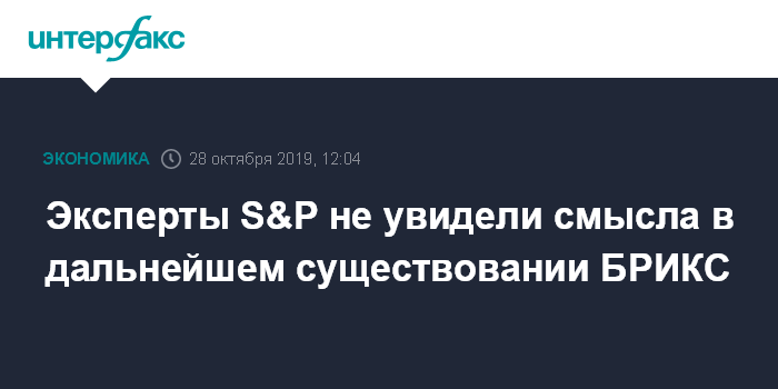 Москва. 28 октября. INTERFAX.RU - Эксперты международного рейтингового агентства S&P Global Ratings больше не видят смысла в объединении Бразилии, России, Индии, Китая и ЮАР в одну группу (БРИКС), учитывая серьезные расхождения темпов экономического роста в этих странах.