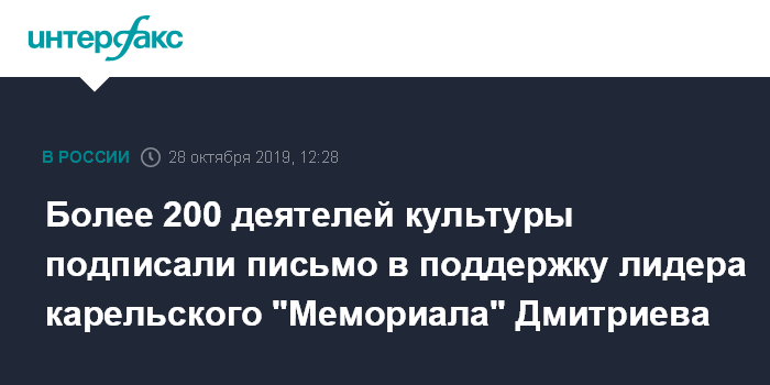 Москва. 28 октября. INTERFAX.RU - Более 200 человек подписали письмо в поддержку руководителя карельского отделения правозащитного центра "Мемориал" Юрия Дмитриева, арестованного по делу о сексуальном насилии.