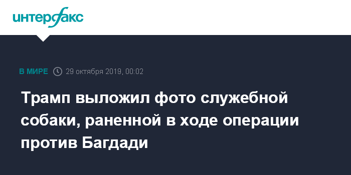 Москва. 28 октября. INTERFAX.RU - Президент США Дональд Трамп в понедельник опубликовал в своем твиттере фотографию служебной собаки, которая получила ранения в ходе спецоперации по ликвидации лидера террористической организации ИГ (запрещена в РФ) Абу Бакра аль-Багдади.