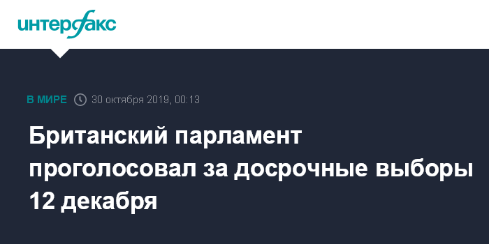 Москва. 30 октября. INTERFAX.RU - Британская палата общин проголосовала во вторник за законопроект о проведении досрочных выборов 12 декабря 2019 года.