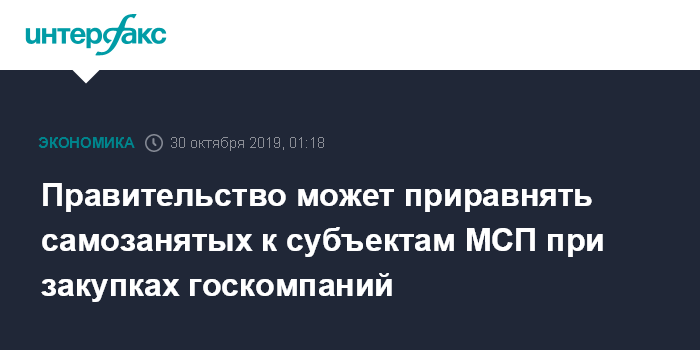 Москва. 30 октября. INTERFAX.RU - Правительство РФ на заседании в среду рассмотрит поправки к закону "О закупках товаров, работ, услуг отдельными видами юридических лиц" (223-ФЗ), согласно которым самостоятельно занятые граждане будут временно приравнены с субъектами малого и среднего предпринимательства (МСП) при закупках госкомпаний.