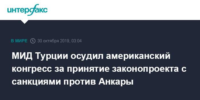 Москва. 30 октября. INTERFAX.RU - С осуждением принятия палатой представителей конгресса США законопроекта с санкциями против Турции выступил турецкий МИД.