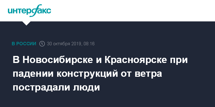 Москва. 30 октября. INTERFAX.RU - В Новосибирске и Красноярске люди пострадали из-за падения конструкций, поврежденных штормовым ветром. Сейчас там устраняют последствия.