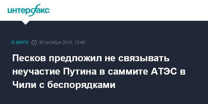 Москва. 30 октября. INTERFAX.RU - Президент Владимир Путин не поедет на саммит АТЭС в Чили 13-14 ноября, но это не связано с беспорядками в Сантьяго, заявил пресс-секретарь главы государства Дмитрий Песков.