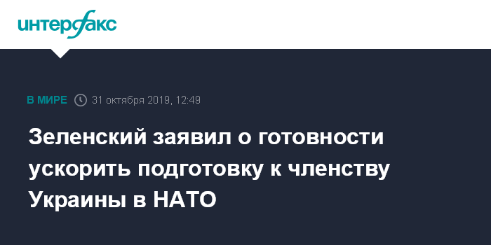 Москва. 31 октября. INTERFAX.RU - Президент Украины Владимир Зеленский заявляет, что Киев готов ускорить подготовку к вступлению в НАТО и на практике доказывать право на получение Плана действий для членства (ПДЧ) в Альянсе.