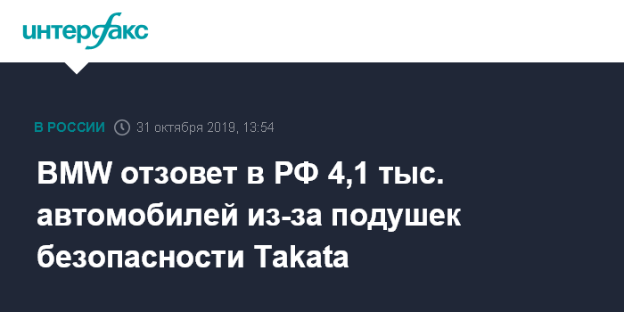 Москва. 31 октября. INTERFAX.RU - Российское представительство немецкого автоконцерна BMW ООО "БМВ Руссланд Трейдинг" отзывает в РФ 4,144 тысячи автомобилей из-за неисправности в конструкции подушек безопасности японской компании Takata, уже становившихся причиной отзыва миллионных партий машин по всему миру.