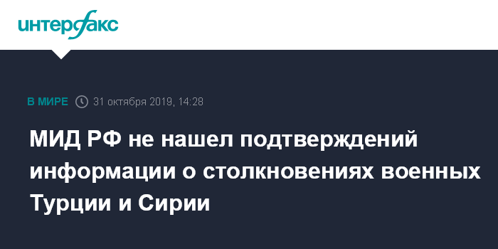 Москва. 31 октября. INTERFAX.RU - Глава МИД РФ Сергей Лавров заявил, что не слышал подтверждений сообщений о якобы имевших место на севере Сирийской Арабской Республики (САР) прямых серьезных столкновений между сирийскими и турецкими военными.