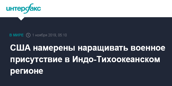 Москва. 1 ноября. INTERFAX.RU - Для реализации национальной оборонной стратегии Соединенным Штатам необходимо наращивать военное присутствие в Индо-Тихоокеанском регионе, заявил министр обороны США Марк Эспер.