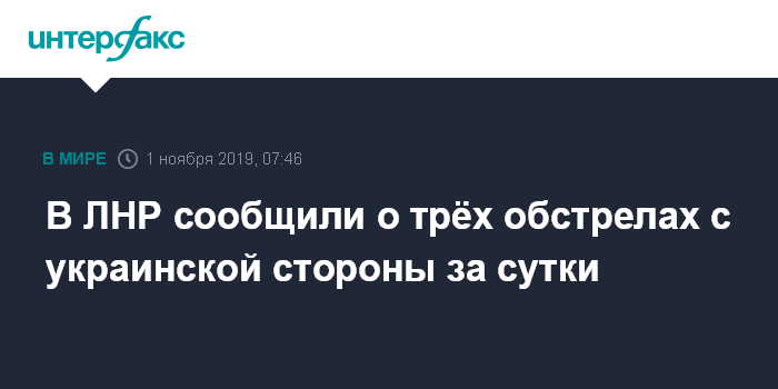 Москва. 1 ноября. INTERFAX.RU - Вооруженные силы Украины три раза за прошедшие сутки обстреляли территорию самопровозглашенной Луганской народной республики (ЛНР), сообщили "Интерфаксу" в представительстве ЛНР в Совместном центре по контролю и координации режима прекращения огня (СЦКК).