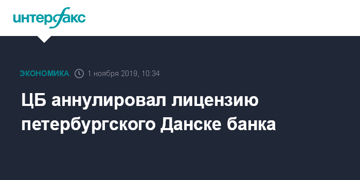 Москва. 1 ноября. INTERFAX.RU - Банк России 1 ноября аннулировал лицензию на проведение банковских операций у петербургского Данске банка по его просьбе. Об этом сообщила пресс-служба регуляторов. По величине активов на 1 октября банк занимал 240-е место в банковской системе страны.
