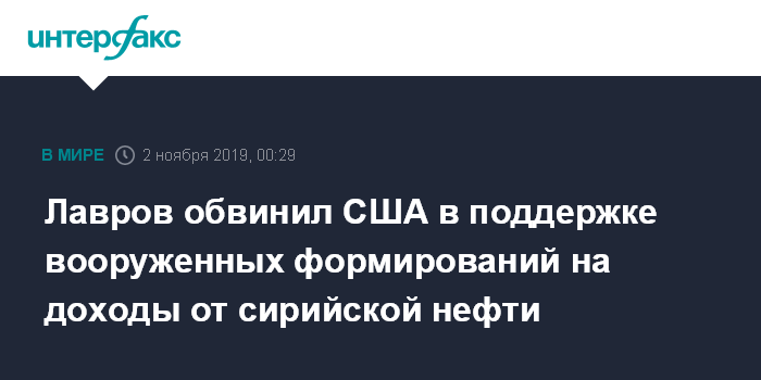 Москва. 2 ноября. INTERFAX.RU - США направляют доходы от продажи нефти с подконтрольных им месторождений на востоке Сирии на поддержку лояльных Вашингтону вооруженных формирований в этой стране, заявил в пятницу глава МИД РФ Сергей Лавров в программе "Международное обозрение" на телеканале "Россия-24" (ВГТРК).