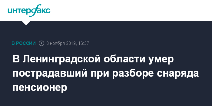 Москва. 3 ноября. INTERFAX.RU - Житель Ленинградской области, который после разбора снаряда был госпитализирован с тяжелыми ожогами, скончался, сообщили "Интерфаксу" в Сланцевской межрайонной больнице в воскресенье.