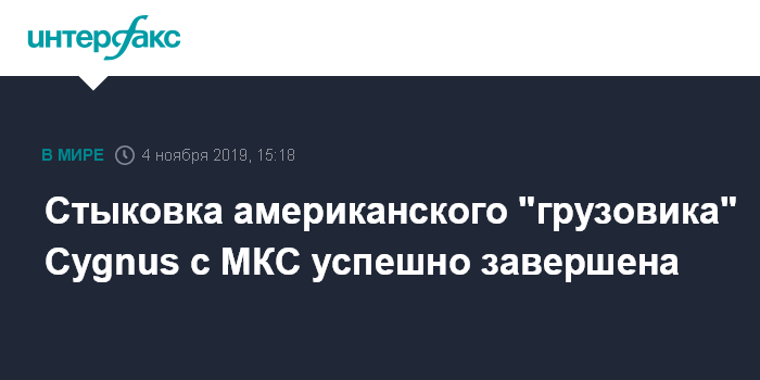 Москва. 4 ноября. INTERFAX.RU - Выведенный на орбиту Земли американский грузовой космический корабль Cygnus в понедельник успешно состыковался с Международной космической станцией (МКС), сообщило Национальное управление США по аэронавтике и исследованию космического пространства (НАСА).