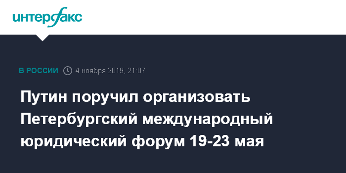 Москва. 4 ноября. INTERFAX.RU - Президент России Владимир Путин подписал распоряжение о проведении 19-23 мая 2020 года Петербургского международного юридического форума.