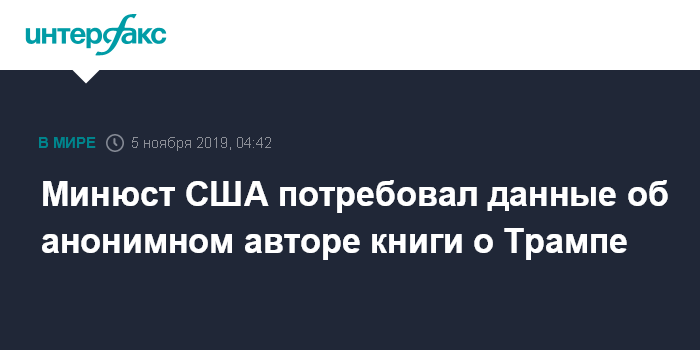 Москва. 5 ноября. INTERFAX.RU - Министерство юстиции США требует предоставить данные о высокопоставленном чиновнике администрации Дональда Трампа, который пишет разоблачительную книгу о президенте США, сообщает The New York Times.