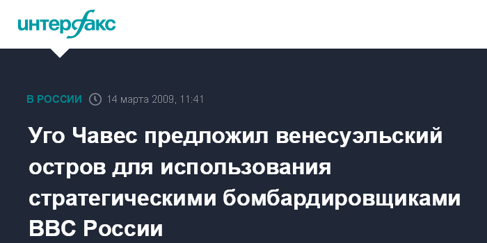 Москва. 14 марта. INTERFAX.RU - Президент Венесуэлы Уго Чавес предложил использовать аэродром на острове Арчила для временного базирования стратегических самолетов российских ВВС, сообщил "Интерфаксу-АВН" начальник штаба Дальней авиации генерал-майор Анатолий Жихарев.