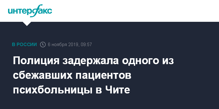 Москва. 6 ноября. INTERFAX.RU - Задержан один из двух сбежавших пациентов психиатрической больницы в Чите, второго беглеца продолжают искать, сообщили "Интерфаксу" в пресс-службе УМВД России по Забайкальскому краю.