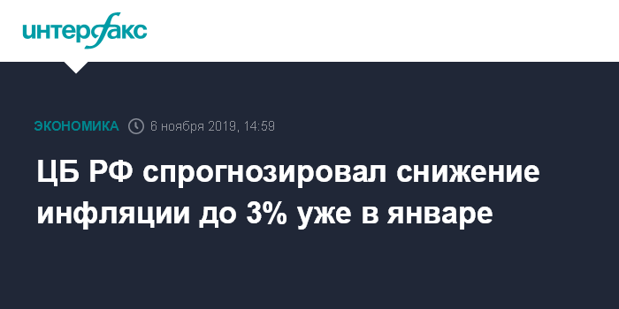 Москва. 6 ноября. INTERFAX.RU - Инфляция в России опустится до 3% уже в январе 2020 года, полагают аналитики ЦБ РФ.