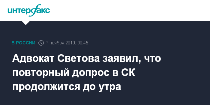 Ранее сообщалось, что Светова отпустили с допроса, однако его адвокат заявил "Интерфаксу", что следом начался повторный допрос.