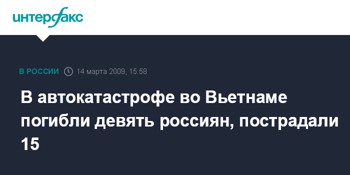 Москва. 14 марта. INTERFAX.RU - МЧС России опубликовало список российских туристов, попавших в автокатастрофу во Вьетнаме. По данным МЧС России, девять человек погибли, 15 - пострадали.