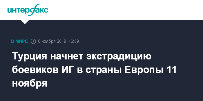 Москва. 8 ноября. INTERFAX.RU - Турция начнет экстрадицию задержанных террористов "Исламского государства" (ИГ, запрещенная в России организация) в страны их происхождения 11 ноября, сообщило в пятницу агентство "Анадолу" со ссылкой на главу МВД Турции Сулеймана Сойлу.
