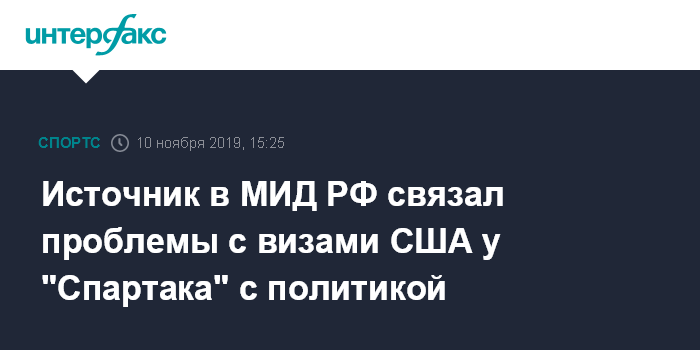 Москва. 10 ноября. INTERFAX.RU - Невыдача американских виз футболистам "Спартака" - это пример недобросовестной конкуренции с использованием политических ресурсов, заявил "Интерфаксу" в воскресенье источник в МИД РФ.