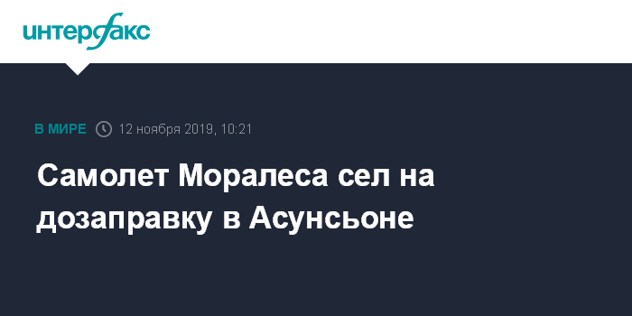 Москва. 12 ноября. INTERFAX.RU - Самолет ВВС Мексики с бывшим президентом Боливии Эво Моралесом приземлился в Асунсьоне для дозаправки, сообщает телекомпания Telesur.
