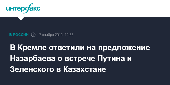 Москва. 12 ноября. INTERFAX.RU - В Кремле прокомментировали предложение первого президента Казахстана Нурсултана Назарбаева об организации переговоров между главами России и Украины Владимиром Путиным и Владимиром Зеленским, отметив, что такая встреча должна быть подготовлена.