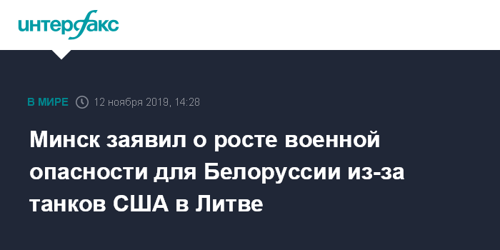 Москва. 12 ноября. INTERFAX.RU - Министр обороны Белоруссии Владимир Равков заявляет о росте военной опасности для страны в связи с размещением американских танков на территории Литвы вблизи белорусской границы.