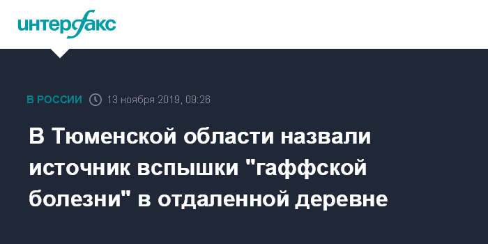 Москва. 13 ноября. INTERFAX.RU - Вспышка редкой "гаффской болезни" в тюменской деревне Ачиры стала рыба из Андреевского озера, которое находится рядом с деревней. О таком выводе экспертов сообщила пресс-служба областного департамента по общественным связям, коммуникациям и молодежной политике.