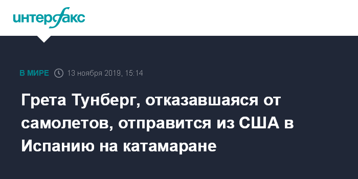Москва. 13 ноября. INTERFAX.RU - Шведская школьница Грета Тунберг, активно выступающая в защиту окружающей среды, доплывет из Северной Америки в Европу на катамаране. Об этом она написала в своем твиттере.