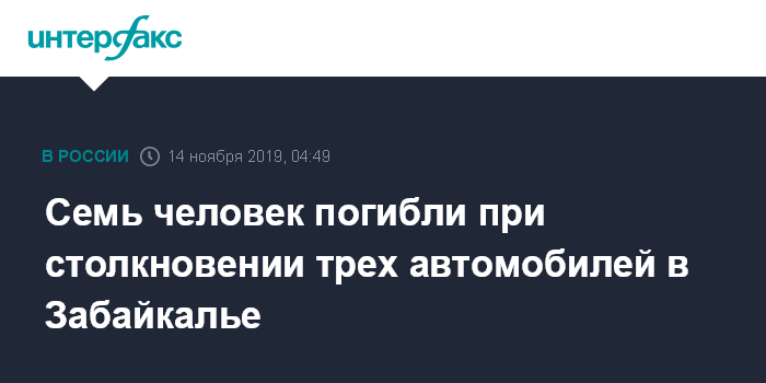 Москва. 14 ноября. INTERFAX.RU - В Забайкальском крае дорожная авария с участием трех автомобилей привела к гибели семи человек, за двумя пострадавшими из Читы вылетел борт санавиации.
