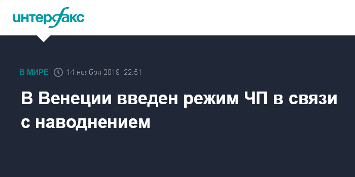 Москва. 14 ноября. INTERFAX.RU - Итальянское правительство в четверг ввело режим чрезвычайного положения в Венеции из-за небывалого наводнения.