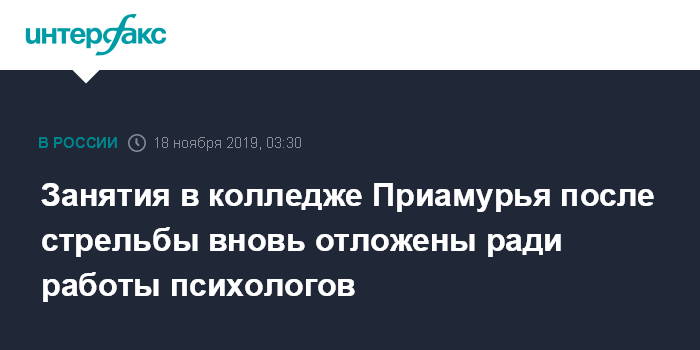 Москва. 18 ноября. INTERFAX.RU - Встречи с психологами вместо занятий намечены в понедельник в Амурском колледже строительства и коммунального хозяйства в Благовещенске после стрельбы, которую устроил студент.