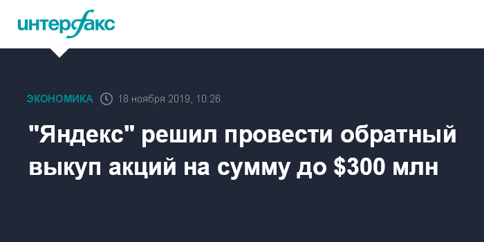 Москва. 18 ноября. INTERFAX.RU - Совет директоров "Яндекса" одобрил проведение buyback акций компании на общую сумму до $300 млн, сообщила компания. Речь идет об акциях класса А нидерландской Yandex N.V.