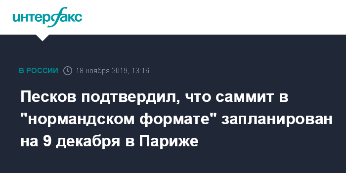 Песков подтвердил, что саммит в "нормандском формате" запланирован на 9 декабря в Париже