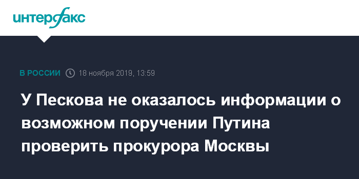 Москва. 18 ноября. INTERFAX.RU - Пресс-секретарь президента РФ Дмитрий Песков заявил, что не располагает информацией о возможном поручении главы государства провести проверку в отношении прокурора Москвы Дениса Попова в связи с публикациями о его имуществе.