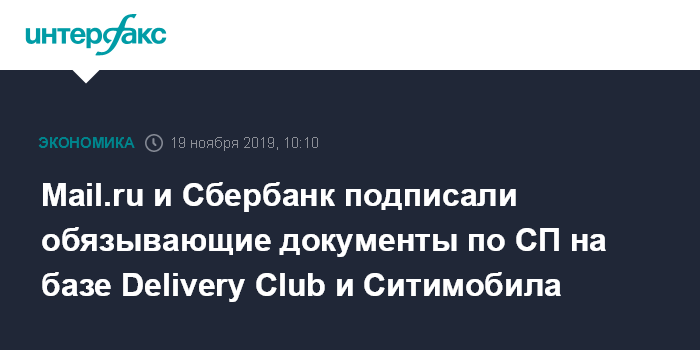 Mail.ru и Сбербанк подписали обязывающие документы по СП на базе Delivery Club и Ситимобила