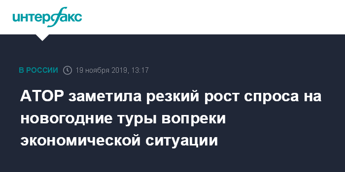 Москва. 19 ноября. INTERFAX.RU - Спрос на организованные новогодние туры по России и за рубеж вырос по различным направлениям на 17-50% в 2019 году, несмотря на не слишком хорошую экономическую ситуацию и отсутствие роста доходов населения, сообщила журналистам во вторник исполнительный директор Ассоциации туроператоров России (АТОР) Майя Ломидзе.