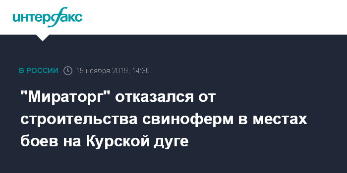 Москва. 19 ноября. INTERFAX.RU - Агропромышленный холдинг "Мираторг" отказался от строительства новых свинокомплексов в Поныровском районе Курской области, где в годы Великой Отечественной войны (ВОВ) шли ожесточенные бои.