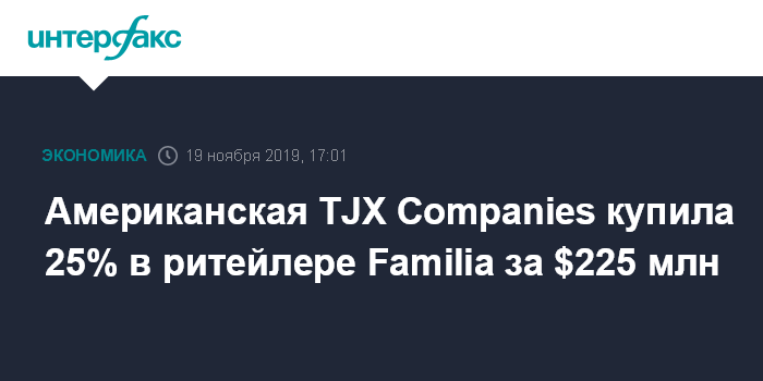 Москва. 19 ноября. INTERFAX.RU - Американская TJX Companies купила 25% в российском off-price ритейлере Familia за $225 млн.