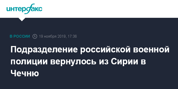 Москва. 19 ноября. INTERFAX.RU - Подразделение военной полиции Южного военного округа (ЮВО) вернулось из Сирии в Чечню, сообщает пресс-служба ЮВО.