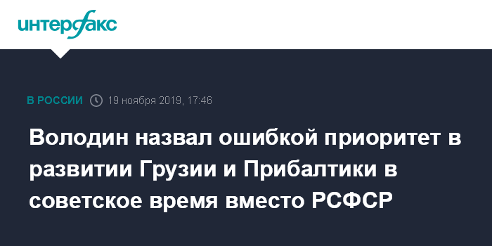 Москва. 19 ноября. INTERFAX.RU - Спикер Госдумы Вячеслав Володин упрекнул коммунистов за то, что в советское время приоритет в развитии отдавался Грузии и прибалтийским республикам вместо РСФСР.