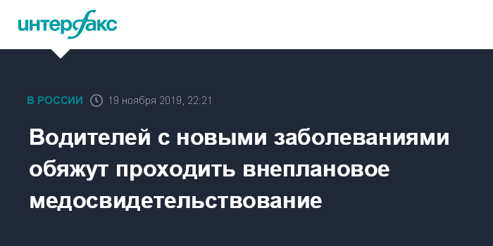 Москва. 19 ноября. INTERFAX.RU - Россияне, у которых в период действия водительских прав возникли противопоказания к управлению автомобилем, будут направлять на внеочередные освидетельствования, в противном случае их права могут быть аннулированы. Соответствующие изменения в федеральный закон "О безопасности дорожного движения" подготовили МВД и Минздрав РФ.