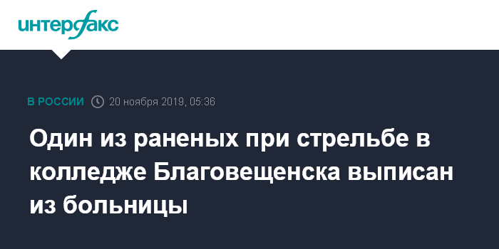 Москва. 20 ноября. INTERFAX.RU - Реанимационные мероприятия завершены по всем пострадавшим во время стрельбы в одном из колледжей Благовещенска, один из подростков выписан из больницы, сообщили журналистам в минздраве Амурской области.