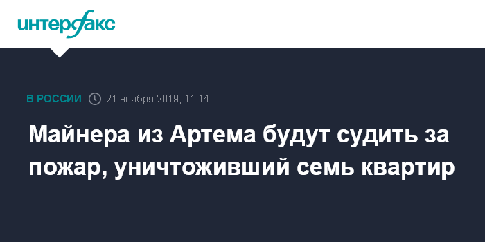 Москва. 21 ноября. INTERFAX.RU - Артемовский городской суд рассмотрит дело владельца майнинговой фермы, которая стала причиной пожара, уничтожившего семь квартир. Ущерб по делу следствие оценило в 53 млн рублей, сообщила представитель МВД Ирина Волк.